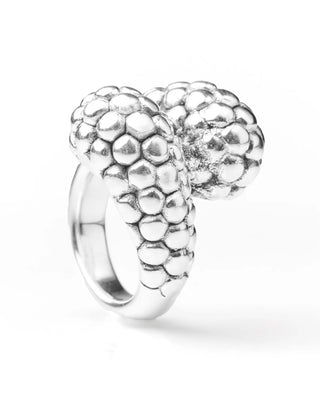 Una de sus piezas favoritas, como dos gotas de agua que no quieren separarse. Sobresalen por su textura comprendida por pequeñas borlas o perlas de caviar hechas en plata en su totalidad.