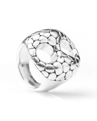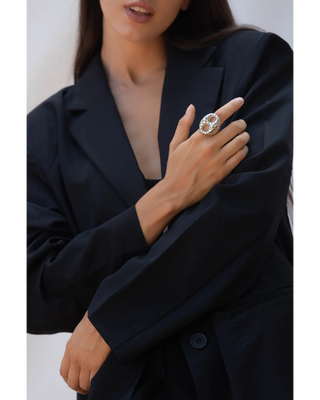 Uno de sus anillos favoritos. Su grandeza, simpleza y textura en el diseño hacen una pieza única. Para las amantes del MÁS ES MÁS