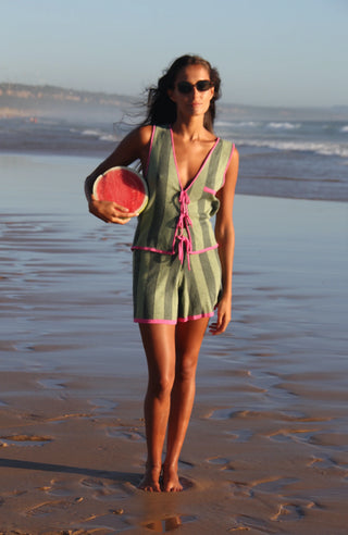 Gillette tejido confeccionado en algodón reciclado y viscosa. Diseño rallado con detalles a color. Amarras delanteras para ajuste