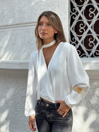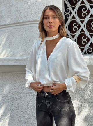 La Blusa Atenas tiene un diseño que combina la comodidad con lo original. Su escote en V, el efecto aglobado que da el elástico y la tirita que va al cuello hace que sea la perfecta mezcla entre elegancia, simpleza y originalidad.