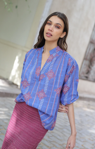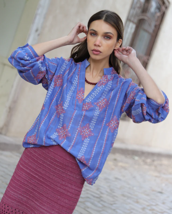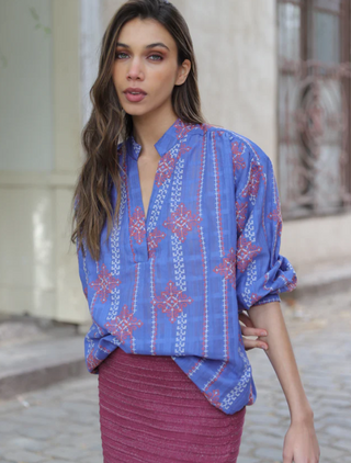 Una prenda especial y única. Nuestra blusa mosquetera destaca por su escote en V y cuello mao, confeccionada en 100% algodón rústico y adornada con un delicado bordado de patrones tipo punto cruz, diseñado exclusivamente por nuestra marca.