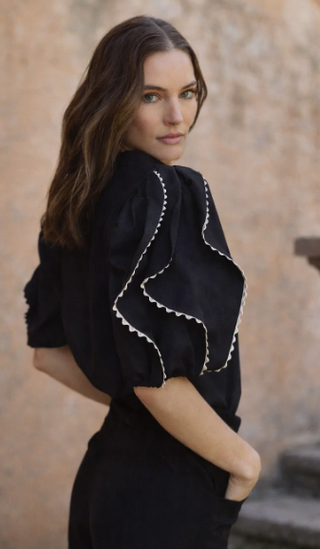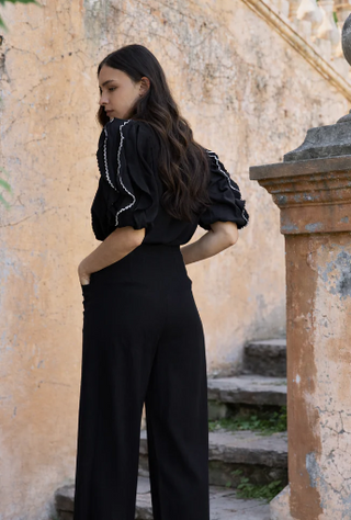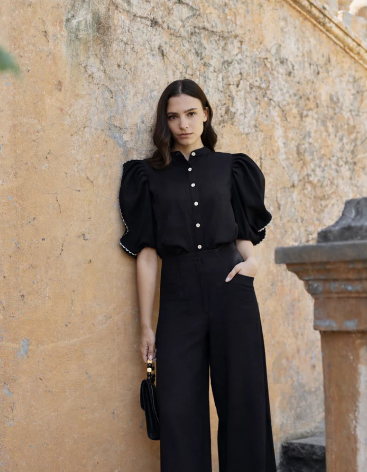 La Blusa Leticia fusiona sencillez y sofisticación. Es una blusa abotonada cuello mao que destaca por sus mangas globo con mucho volumen. Perfecta para acompañar con pantalones o faldas de lino y resaltar la elegancia natural de quien la lleva.