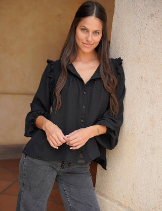 La Blusa Marbella es de esas prendas que combinan lo clásico con lo relajado. Tiene volantes delicados en los hombros y un corte suelto que la hace muy cómoda, perfecta para usar todo el día sin perder estilo.