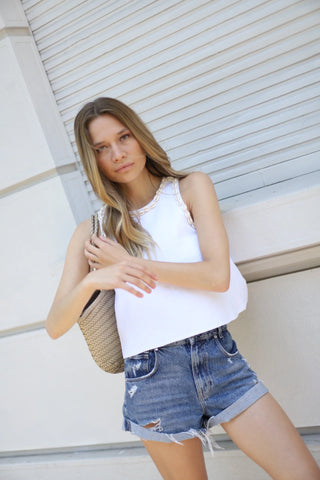 Descubre la blusita ideal para este verano: una preciosa blusa de viscosa y lino en un suave tono blanco. Su diseño presenta un cuello musculoso y un delicado bordado de conchitas, meticulosamente elaborado a mano por talentosas mujeres. La espalda abierta, adornada con dos botones en forma de concha perla, añade un toque de sofisticación y frescura a tu look.