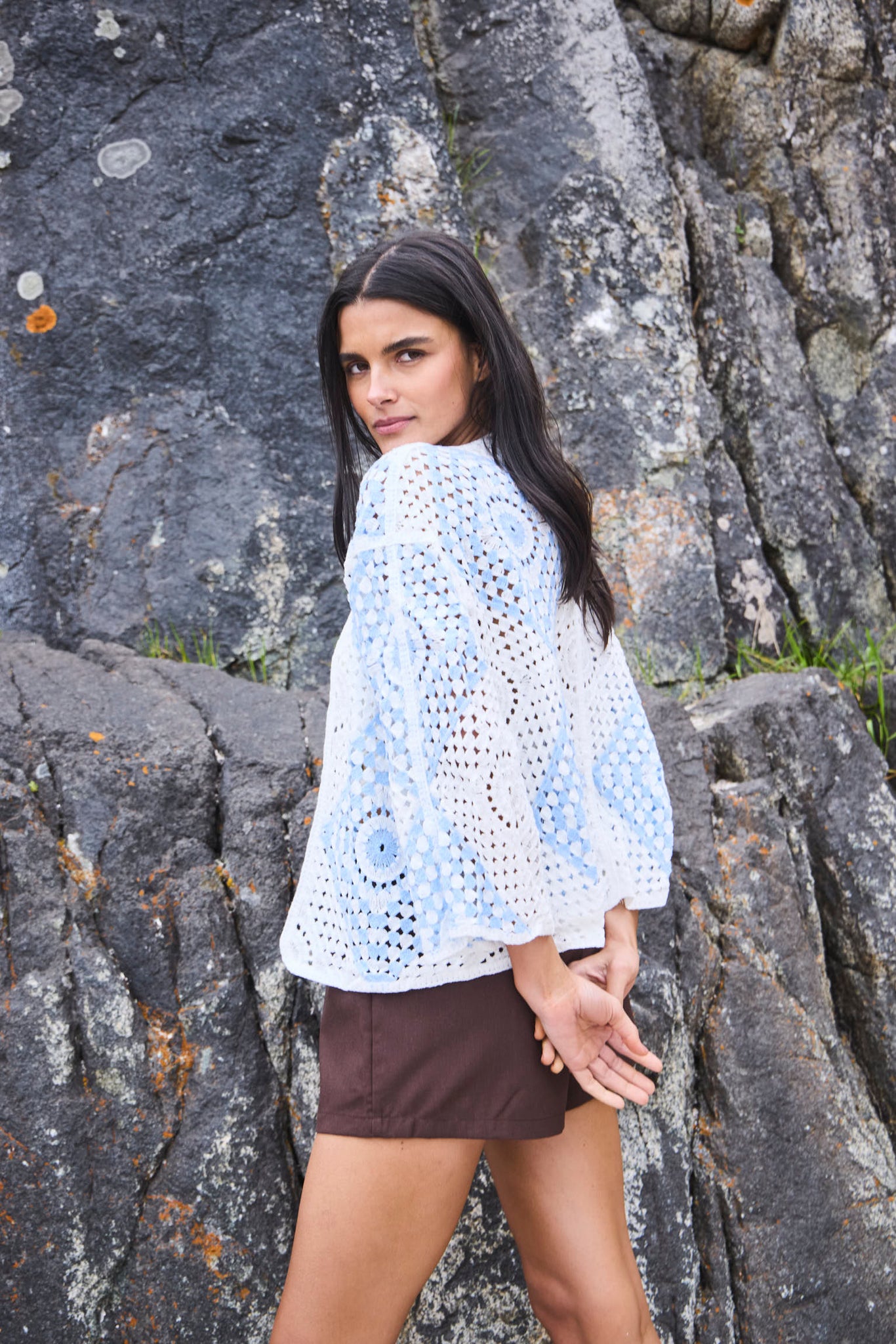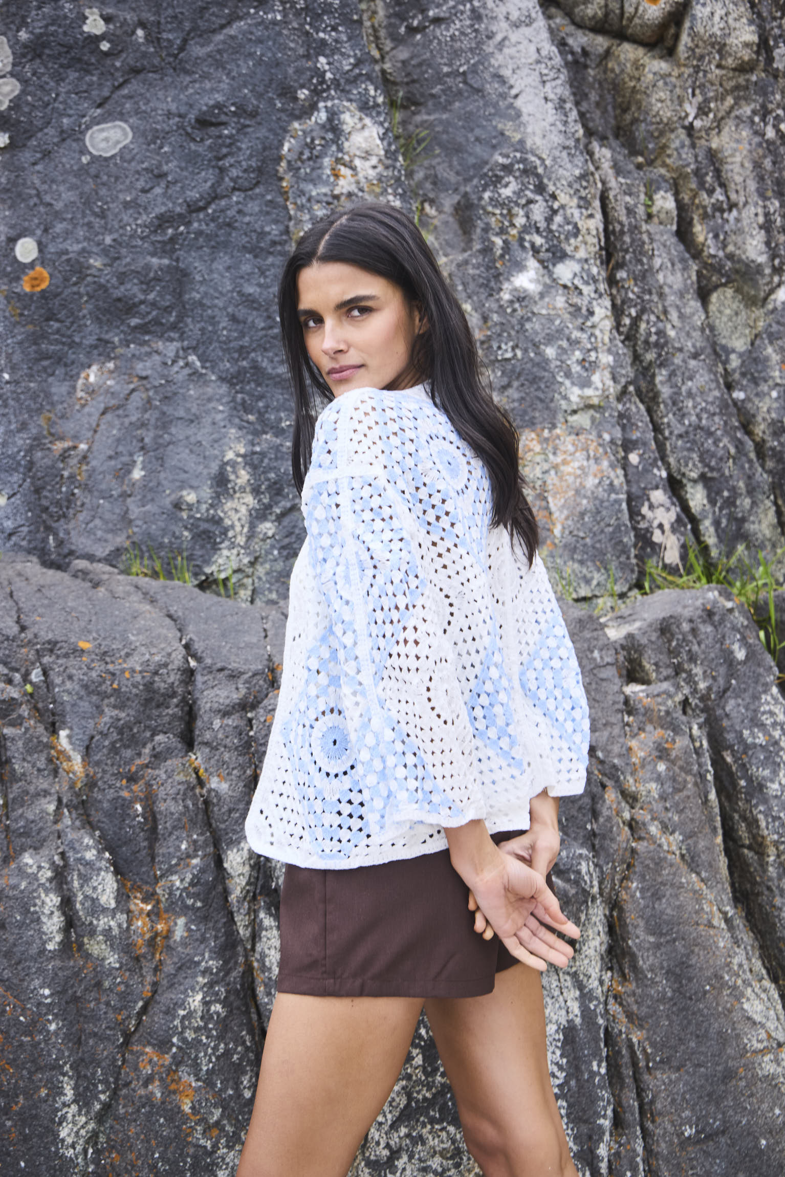 Chaleco abierto tejido a crochet confeccionado 100% algodón. Diseño bicolor en crudo y celeste combina artesanía y estilo, ideal para aportar textura y frescura a tus looks de verano. De calce suelto y cómodo, se adapta fácilmente a diferentes siluetas gracias a su talla única y caída liviana.