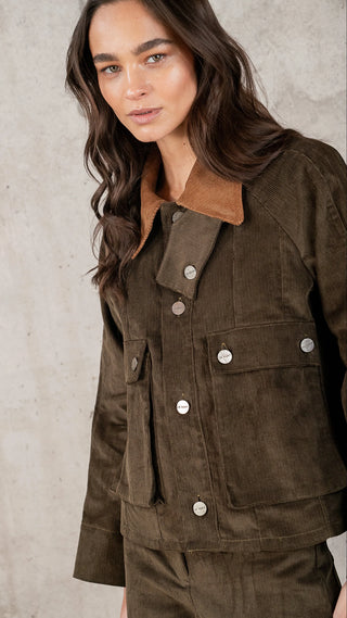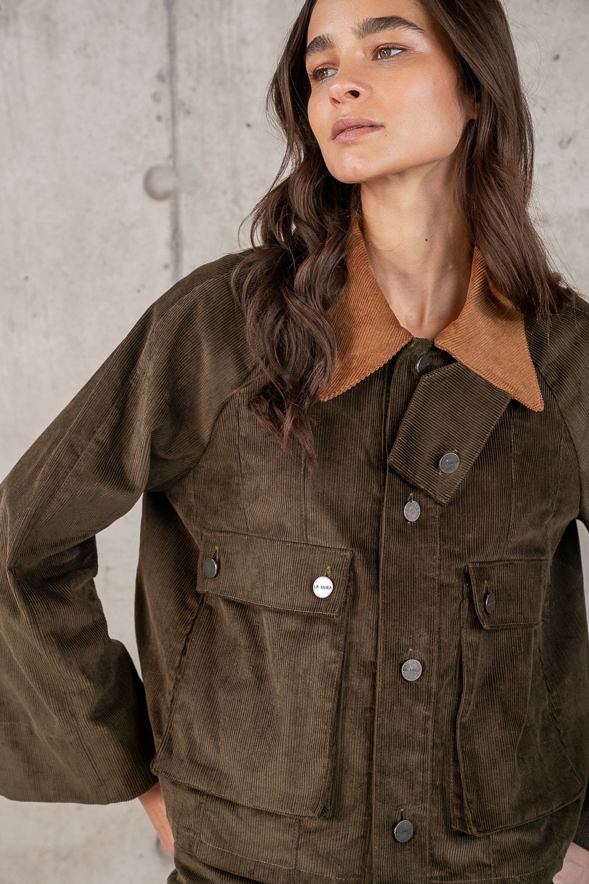 La modelo usa la talla S en chaqueta y pantalón talla 34.