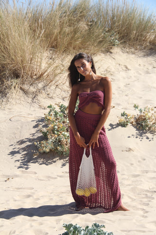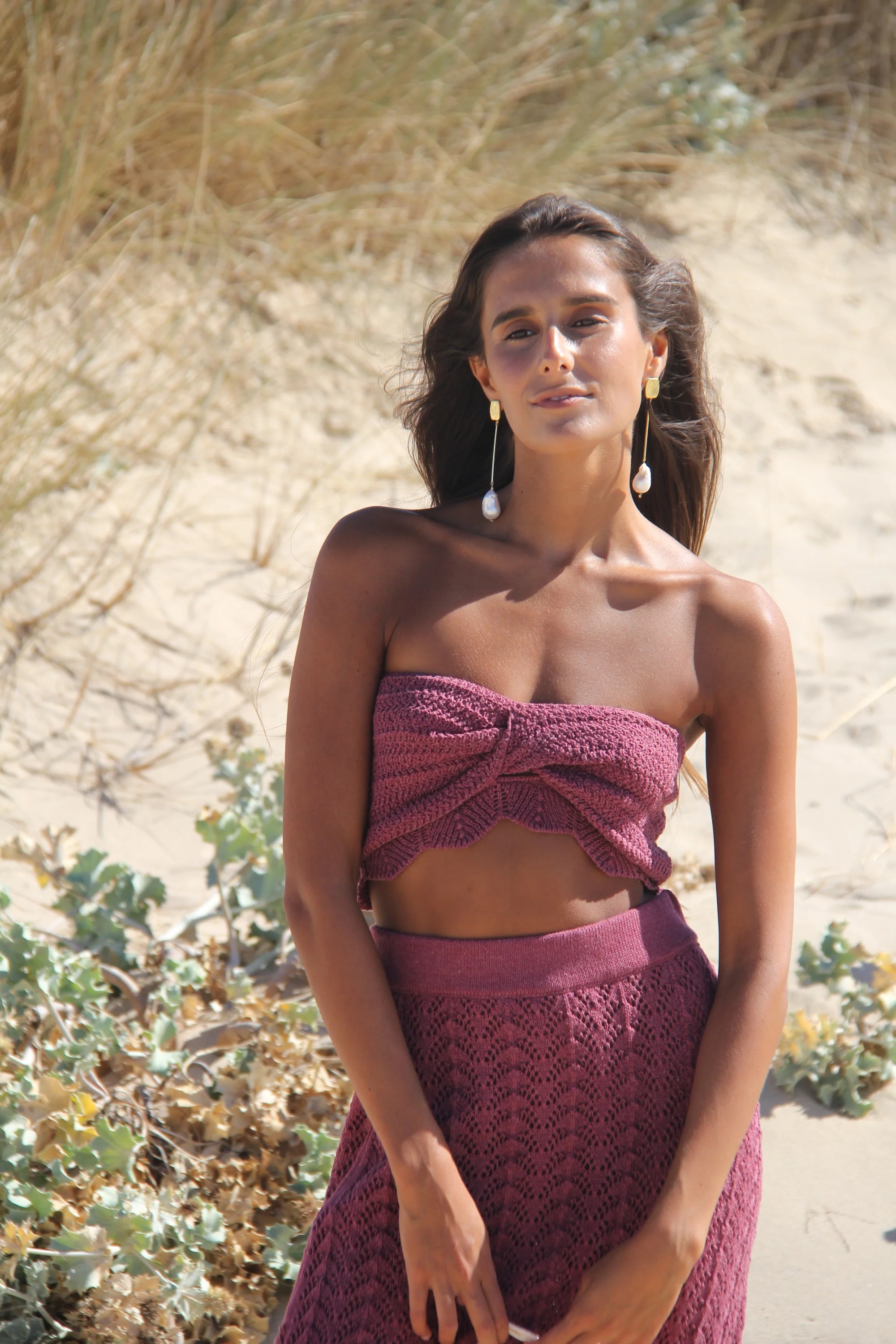 El Conjunto tejido en algodón viscosa y punto calado, este conjunto es una declaración de estilo. Además, su top strapless calado y falda con pretina elasticada y forro interior añaden un toque de elegancia y sofisticación.