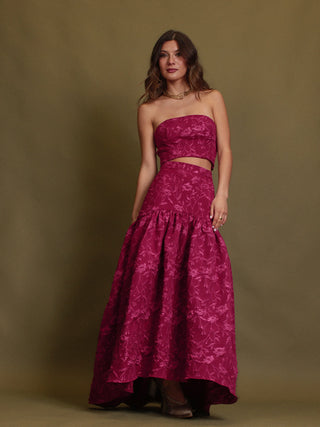 La falda, en cambio, se roba la escena. Larga, con su vuelo voluminoso y una textura bordada que brilla sin reflejar. Porque lo importante está en los detalles, y en cómo lo luces.
