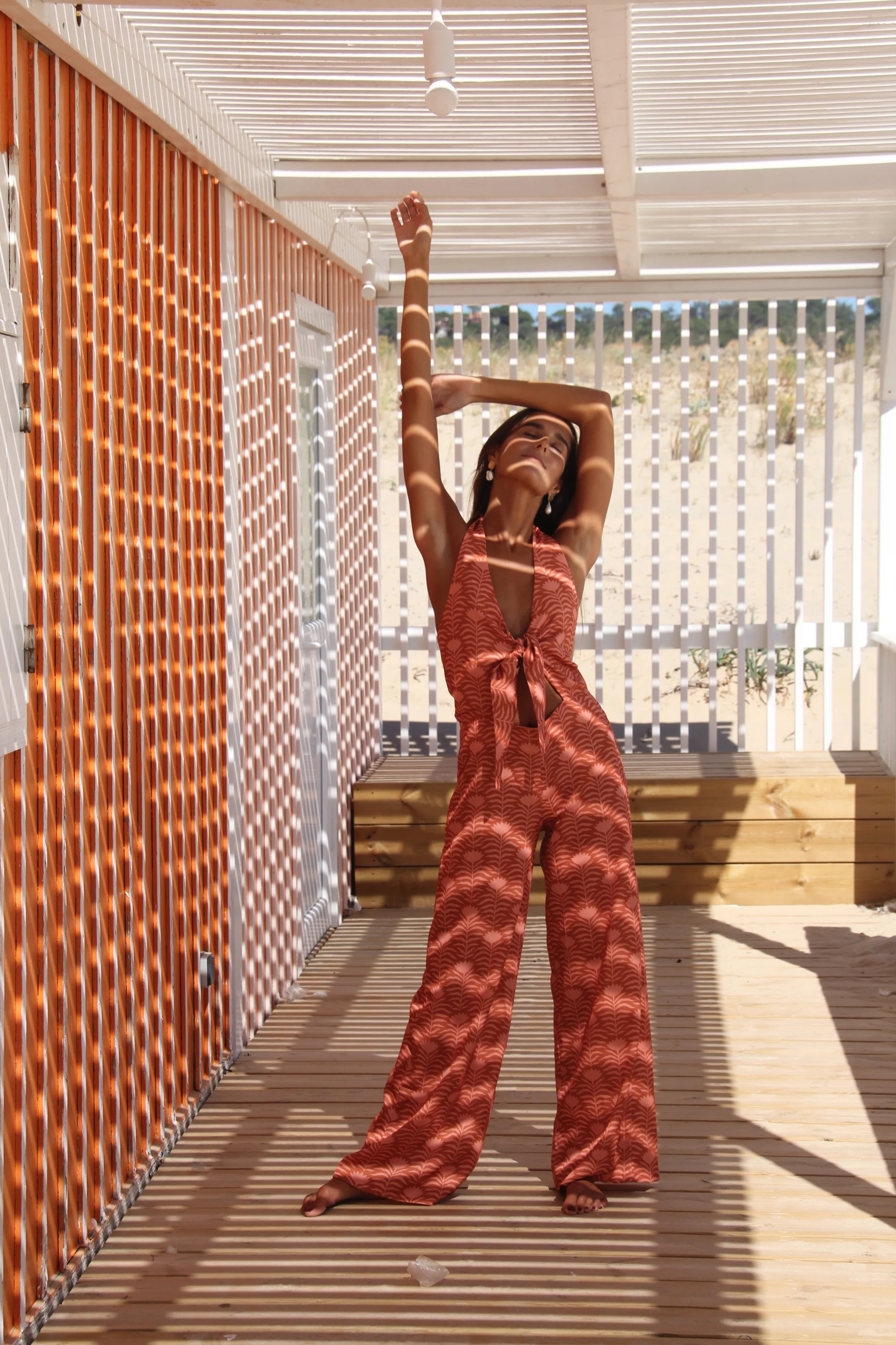 Enterito estampado confeccionado en poliester estampado diseñado por nosotras. Amarrado al cuello y al frente lo que lo hace adaptable a distintos cuerpos y tallas. Espalda elasticada y cierre invisible.