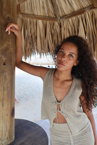 Gillet artesanal tejido en suave algodón peruano, de calce holgado y liviano. Presenta dos amarras frontales que permiten un cierre sutil y aportan un toque delicado y natural al diseño.