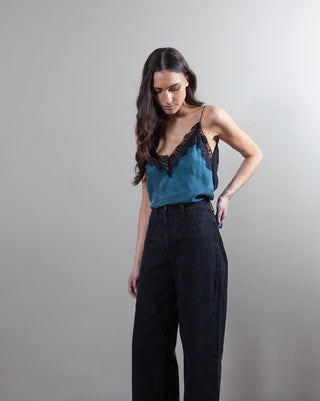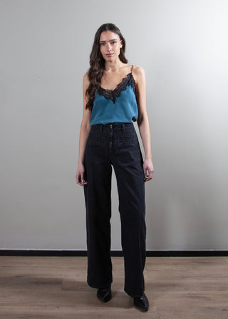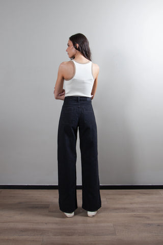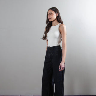 Los jeans Mara son la pieza clave para un look sofisticado y moderno. Confeccionados en 100% algodón, su tacto es suave y su corte wide leg te ofrece una silueta fluida y relajada, perfecta para el día a día. El color negro lavado y el cierre delantero los convierten en un pantalón versátil que puedes combinar fácilmente.