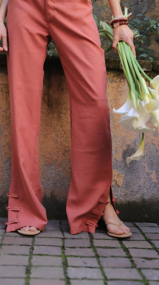 Pantalón de silueta fluida con un diseño distintivo: aperturas laterales adornadas con botones japoneses de nudo hechos a mano, que funcionan como cierre y detalle decorativo a la vez. Confeccionado en suave tela cupro (93% Rayón Viscosa – 7% Poliéster), ofrece una caída elegante y un tacto ligero.