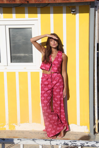 Pantalón confeccionado en poliester sublimado diseñado por nosotras. Corte recto holgado, con tapetas delantera y trasera y pabilos en piernas