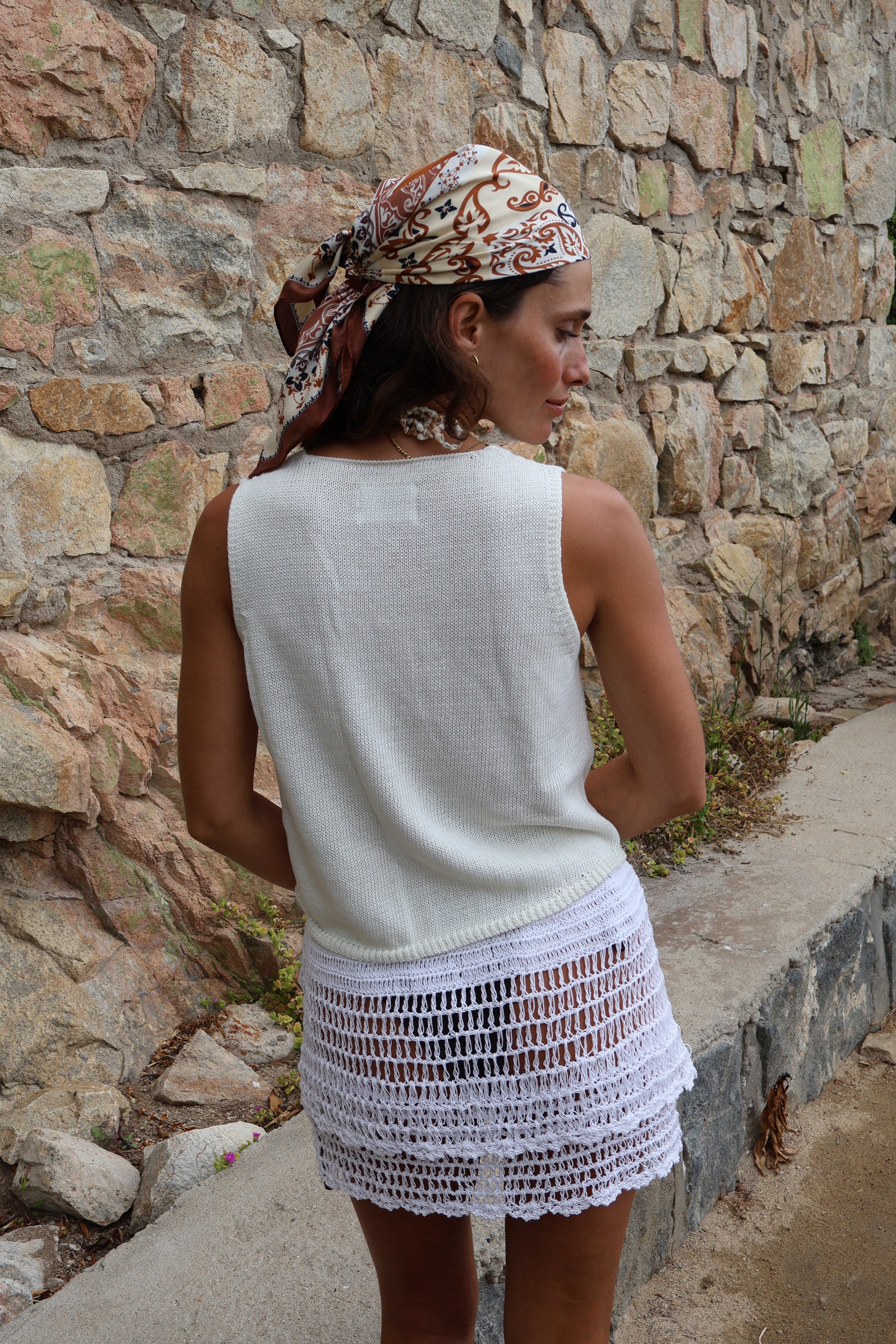 Pollera corta tejida en diseño calado tipo malla, de textura liviana y fresca ideal para el verano. Cuenta con cintura elasticada y amarre ajustable con borlas, permitiendo adaptarse cómodamente al cuerpo. Su tejido translúcido aporta un estilo playero y artesanal perfecto para usar sobre traje de baño o con prendas ligeras.