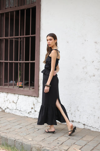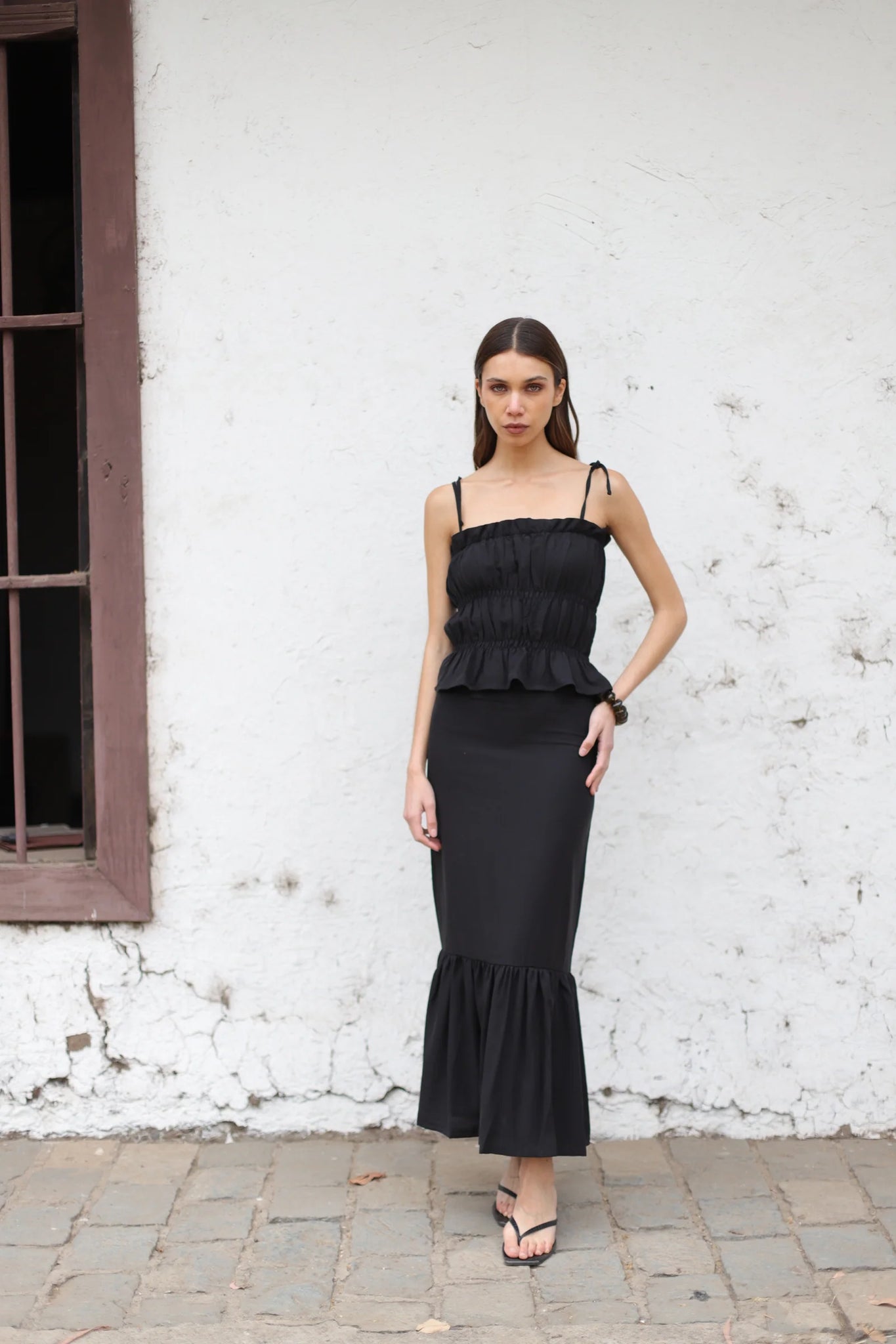 La Pollera Tania Negra es una prenda de estilo tubo con largo midi, diseñada para ofrecer comodidad y elegancia. Su terminación en vuelo y el tajo trasero permiten una mayor movilidad, haciéndola perfecta para cualquier ocasión. Fabricada con una mezcla de 70% lyocell y 30% lino, esta pollera proporciona una sensación de frescura y ligereza.