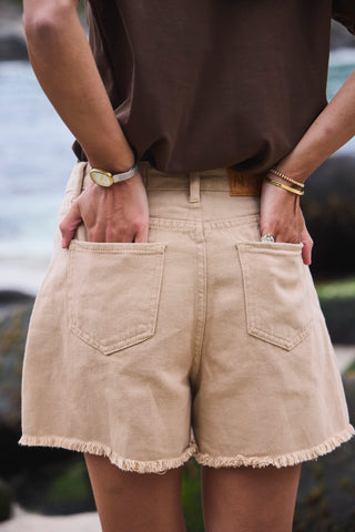 Short a la cintura en denim liviano color arena, ideal para el verano por su calce cómodo, fresco y relajado. Terminado con flequillos en el bajo para un toque descontracturado y playero.