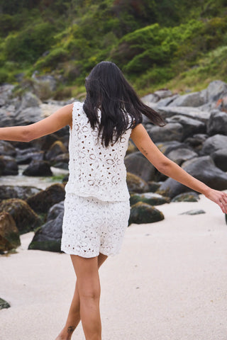 Short veraniego tejido a crochet, de calce holgado y suelto para máxima comodidad en días cálidos. Su textura artesanal y liviana lo convierten en una prenda ideal para complementar looks frescos de temporada.