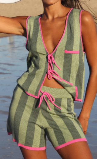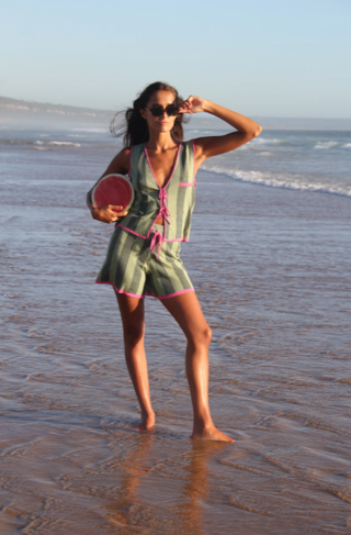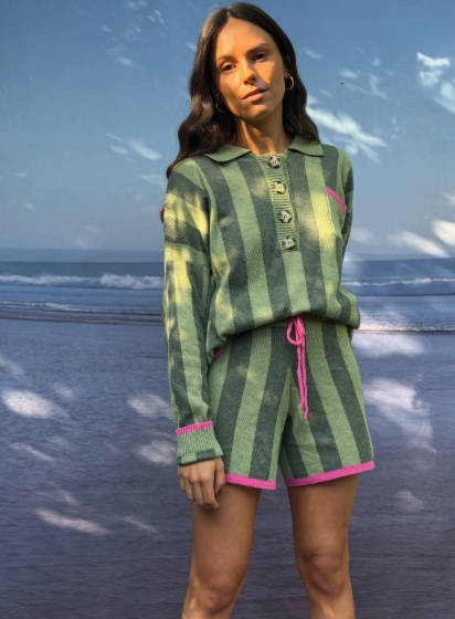 Short tejido confeccionado en algodón reciclado y viscosa. Diseño rallado con detalles a color. Amarras en cintura para mayor ajuste.