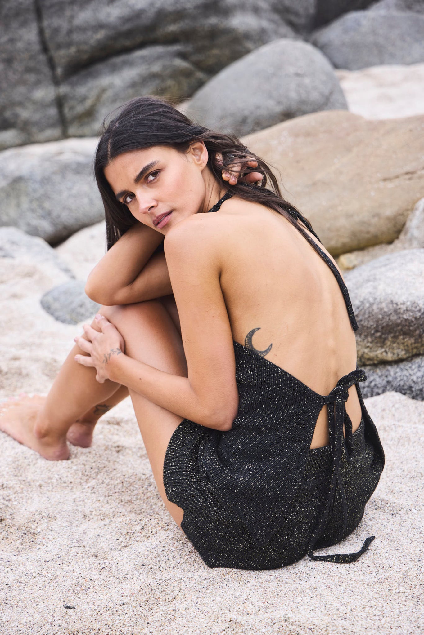 Short tejido en algodón peruano con sutiles detalles en hilos dorados que aportan un brillo delicado. De tejido liviano y fresco, cuenta con cintura elasticada con amarre para un ajuste cómodo y adaptable al cuerpo.