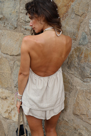 Top de escote halter con delicado fruncido en el cuello que aporta caída y movimiento. Su silueta suelta y liviana lo convierte en una prenda fresca y cómoda para días cálidos. De diseño minimal y femenino, deja los hombros al descubierto y estiliza la parte superior del cuerpo con un acabado natural y elegante.