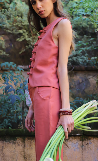 Blusa sin mangas con cierre japonés y delicados botones de nudo hechos a mano. Confeccionada en suave tela cupro (93% Rayón Viscosa – 7% Poliéster), que ofrece una caída fluida, tacto ligero y un acabado elegante.