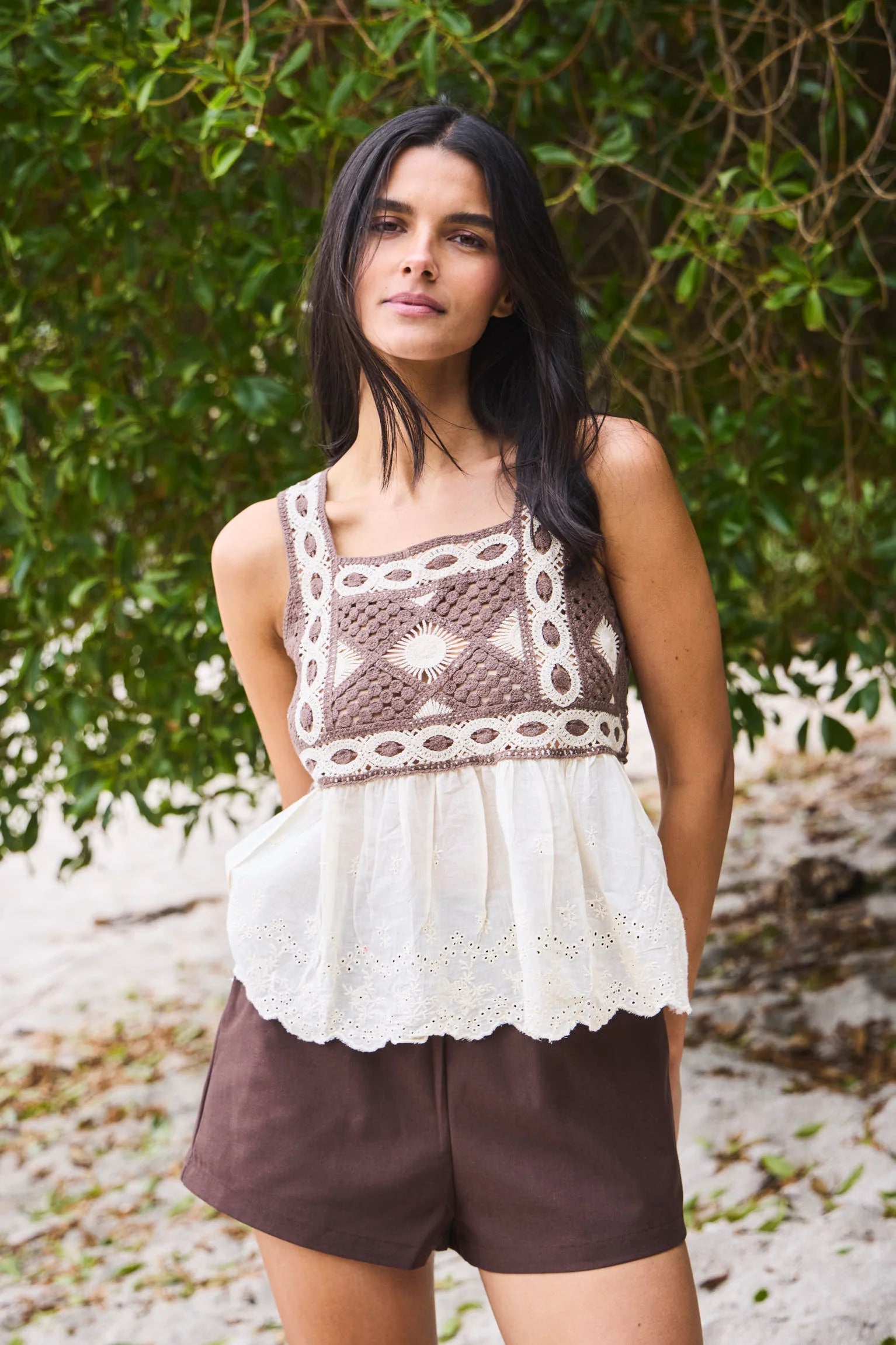 Top combinado con parte superior tejida a crochet en algodón café y base de tela con delicado bordado broderie. Incluye tiras también tejidas a crochet para un acabado artesanal uniforme.
