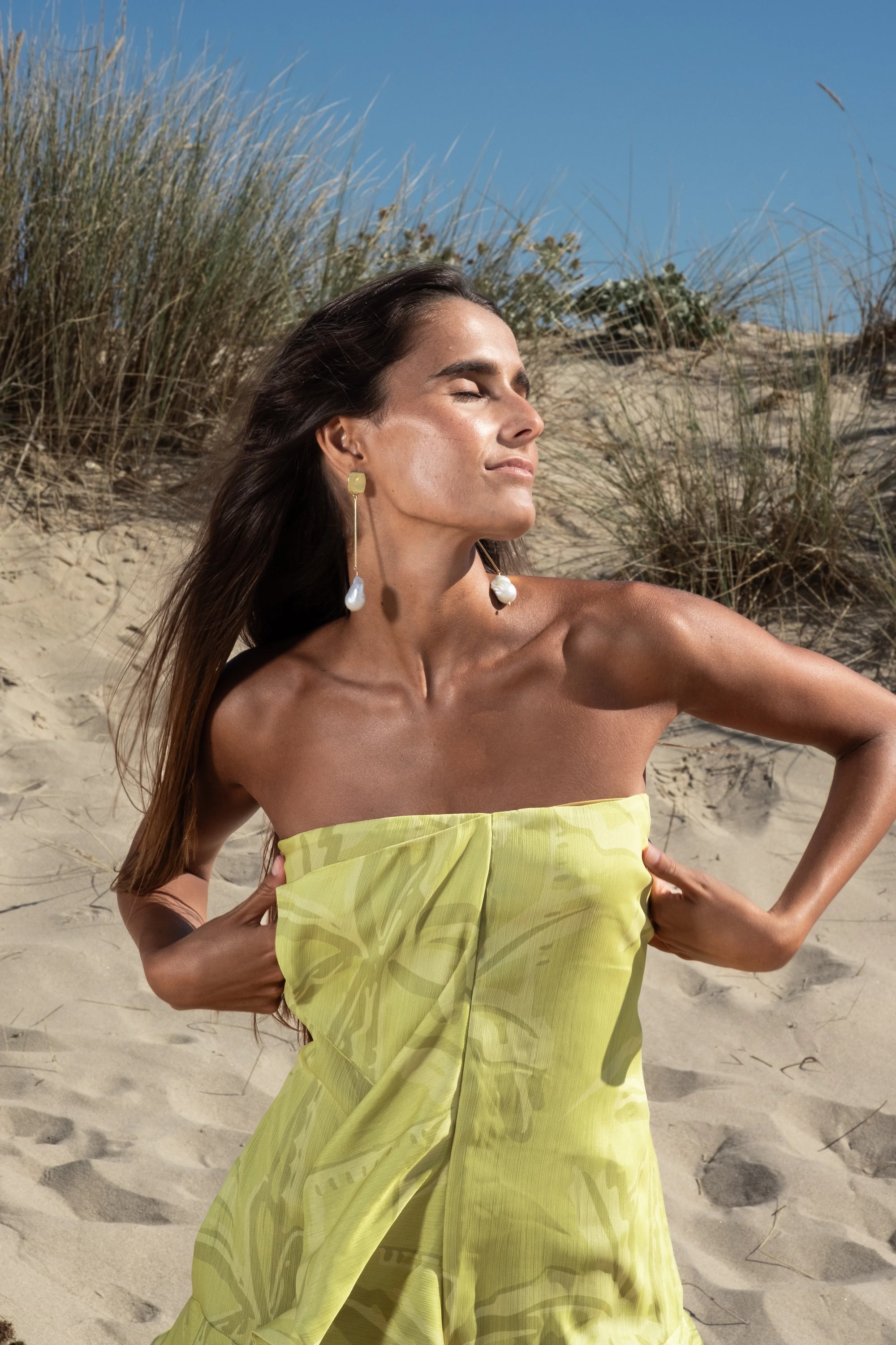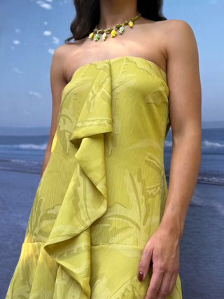 Vestido strapless confeccionado en satín sublimado diseñado por nosotras, forrado. Elástico en espalda para flexibilidad en tallas y mejor agarre. Vuelo delantero que le da movilidad al vestido
