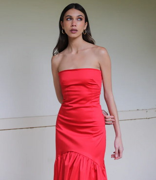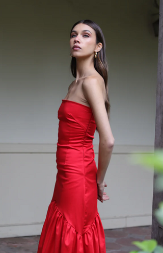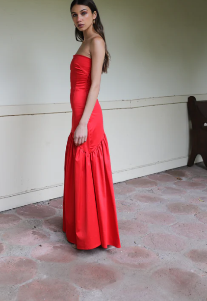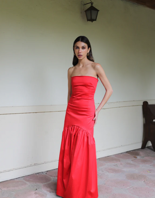 Diseñado con corte strapless y pinzas que realzan la figura, se ajusta perfectamente al cuerpo. Su detalle de corte en arco sobre la cadera termina en un ruedo amplio y voluminoso que aporta movimiento y estilo.