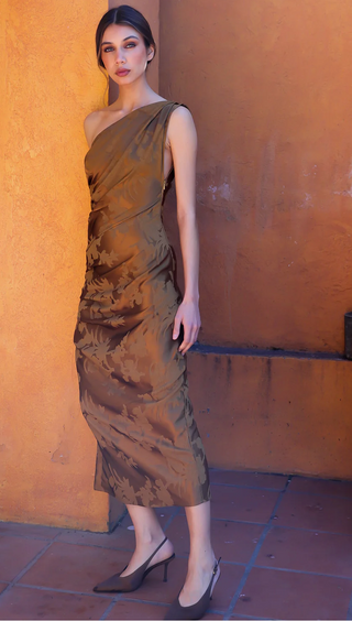 Vestido de un solo hombro diseñado para estilizar y realzar la figura. Presenta un plisado lateral que acompaña delicadamente la silueta, un tajo lateral que aporta movimiento y un cierre invisible al costado para un calce impecable. Confeccionado en una exquisita tela Jacquard satinada 100% Viscosa, con sutiles patrones florales a tonoque le otorgan un acabado sofisticado y único.