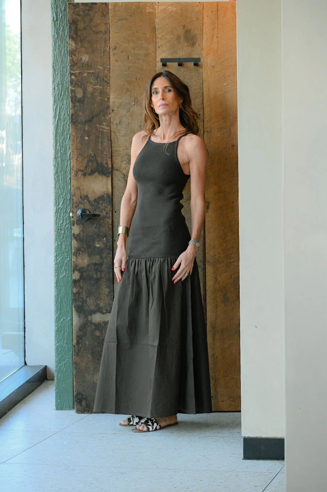 Vestido de silueta delicada con escote tipo bote y tirantes finos, que combina texturas de manera sutil y elegante. El cuerpo, tejido en punto de 100% algodón, abraza suavemente hasta la cadera, donde se une a un ruedo amplio y voluminosoconfeccionado en tela plana al tono, que aporta movimiento y contraste.