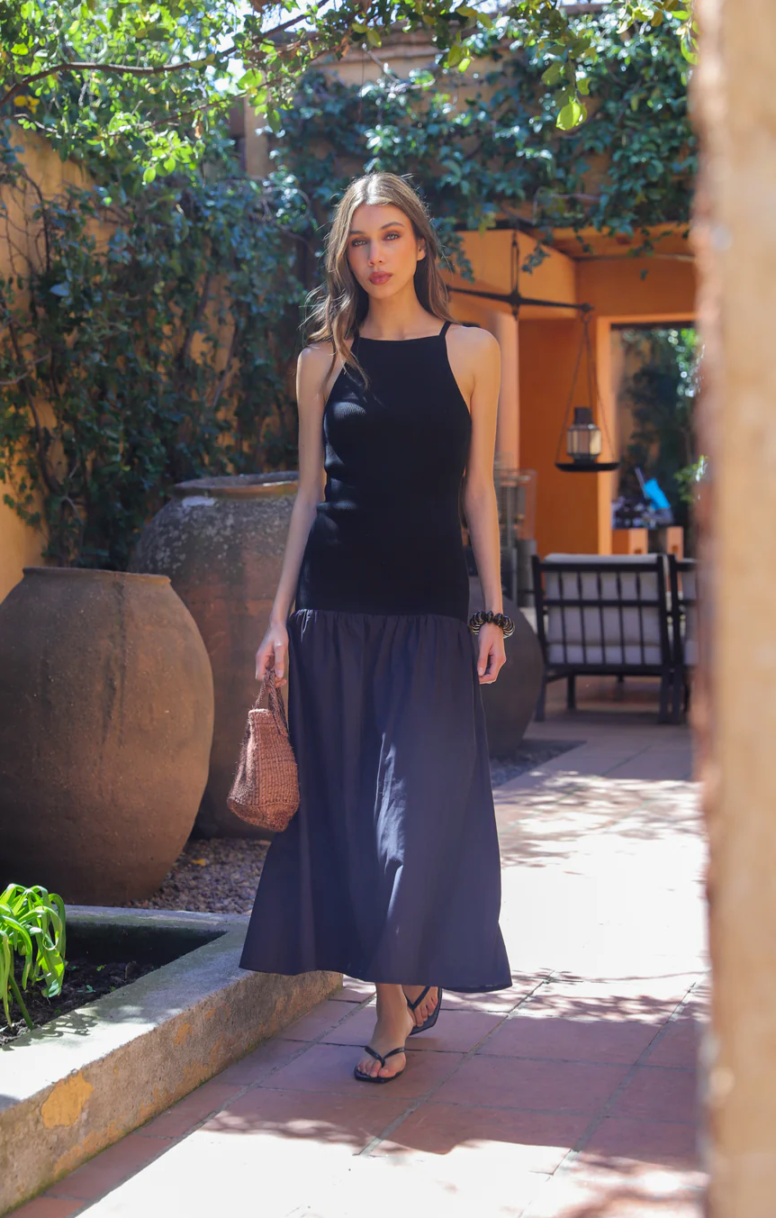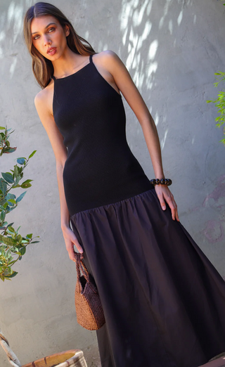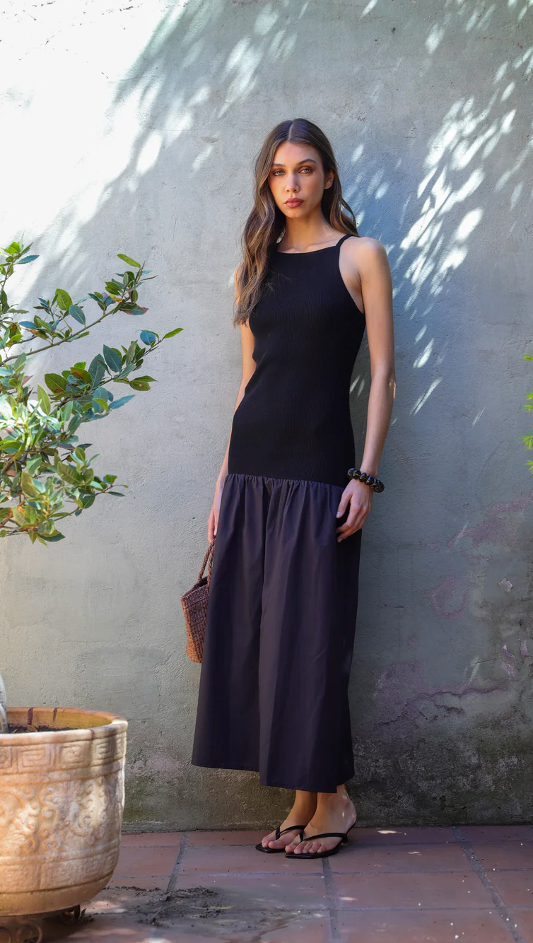 Vestido de silueta delicada con escote tipo bote y tirantes finos, que combina texturas de manera sutil y elegante. El cuerpo, tejido en punto de 100% algodón, abraza suavemente hasta la cadera, donde se une a un ruedo amplio y voluminosoconfeccionado en tela plana al tono, que aporta movimiento y contraste.