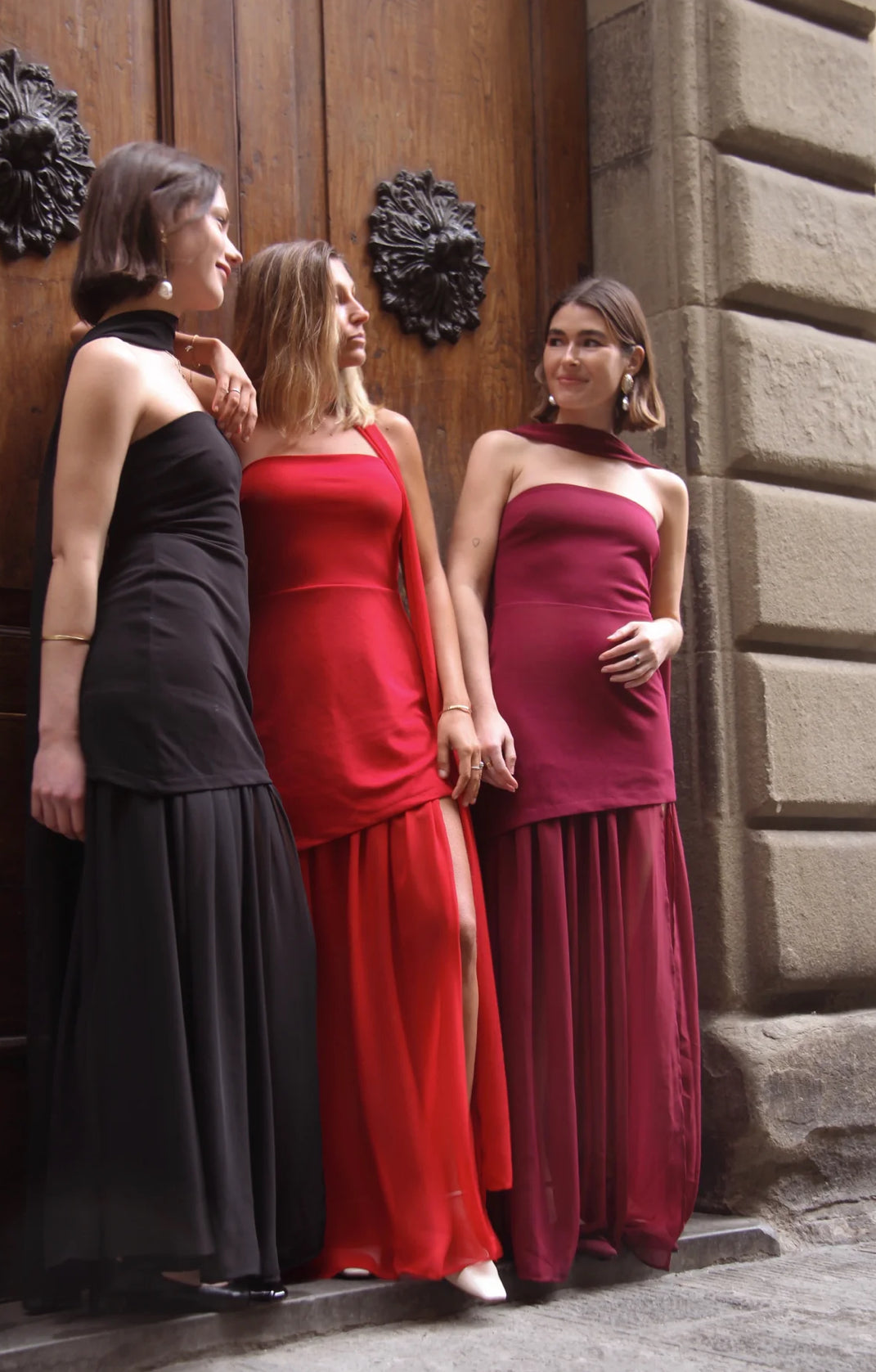 Vestido strapless confeccionado en crep y gasa. Parte del cuerpo confeccionado en crep elasticado que se adapta mejor a cada tipo de cuerpo. Falda confeccionada en gasa con apertura en pierna. Cierre lateral invisible. Trae una bufanda de gasa para complementar el vestido.