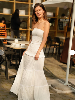 Lo hicimos con un lino exquisito, ligero y muy suave. Es elasticado, queda muy bien para todos los cuerpos porque se ajusta increíble.