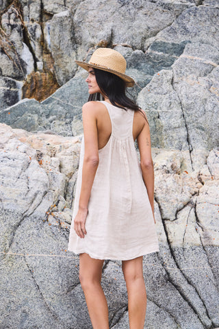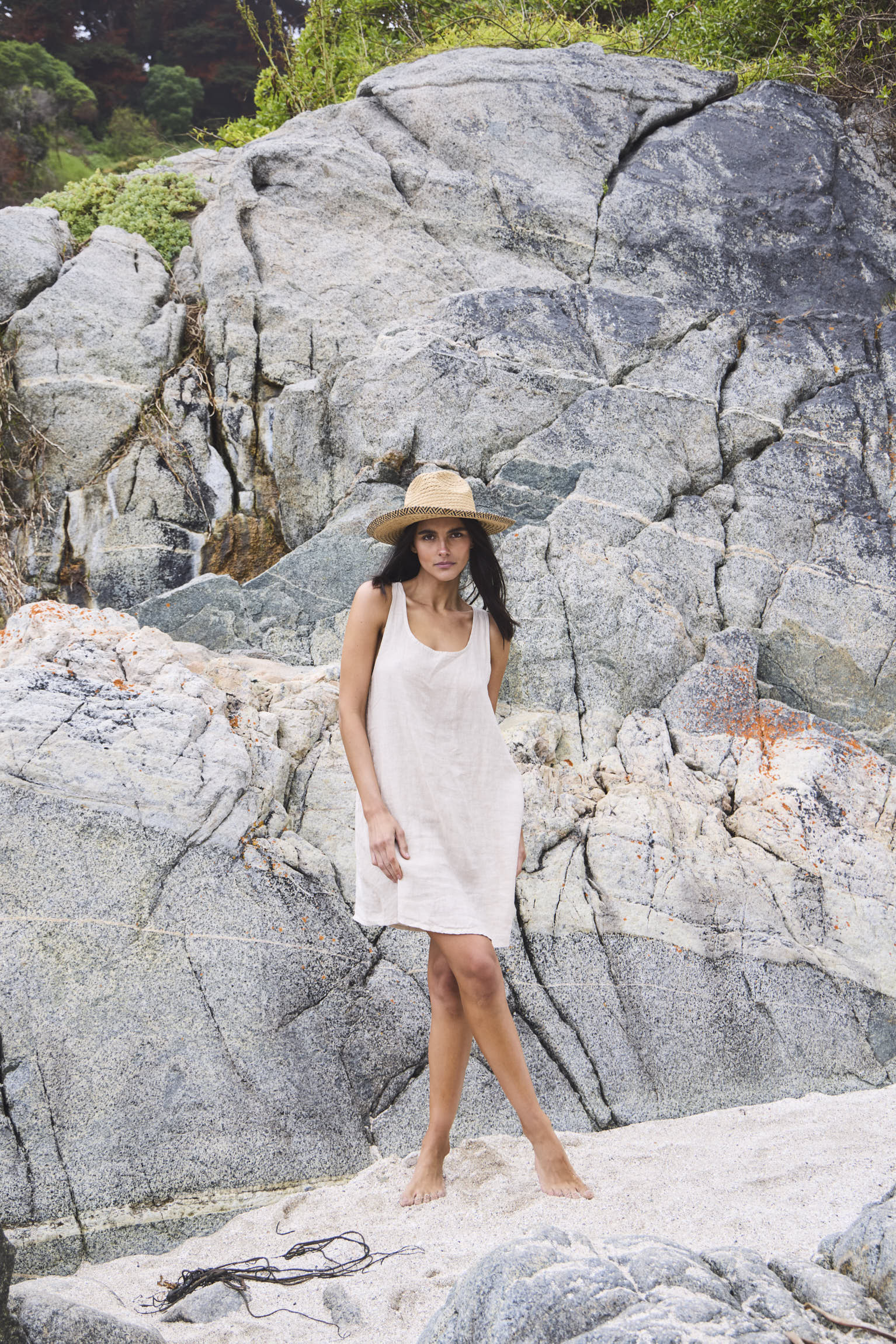 Vestido confeccionado en lino de composición orgánica, ideal para días cálidos por su textura fresca, ligera y natural. Su caida limpia y respirable lo convierte en un básico veraniego, cómodo y versátil.